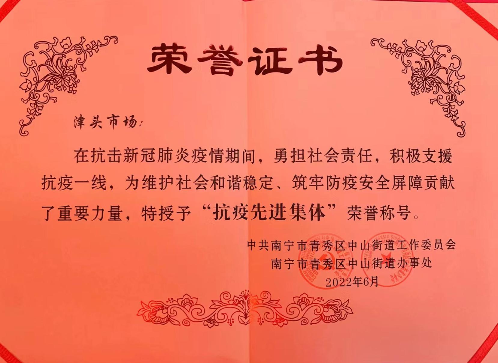 近日,為表彰在抗擊新冠肺炎疫情中的突出貢獻(xiàn),南寧市青秀區(qū)中山街道辦授予威寧市場(chǎng)公司經(jīng)營(yíng)管理的津頭市場(chǎng)“抗疫先進(jìn)集體”稱號(hào)。