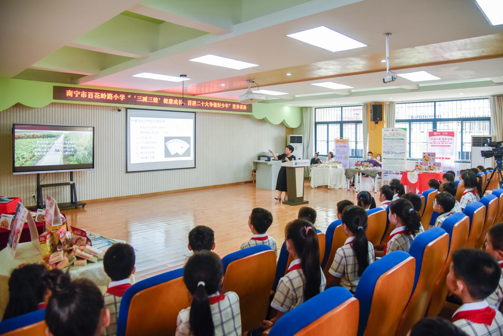 本次活動(dòng)由南寧市百花嶺路小學(xué)和威耀供應(yīng)鏈公司聯(lián)合主辦,邀請(qǐng)了南寧市疾控中心營(yíng)養(yǎng)學(xué)專家、國(guó)家注冊(cè)營(yíng)養(yǎng)師、國(guó)家二級(jí)健康管理師張靜主講?;顒?dòng)主要分為營(yíng)養(yǎng)講座、知識(shí)競(jìng)答、食材試吃三個(gè)環(huán)節(jié),學(xué)校師生、家委代表共160余人參加活動(dòng)。