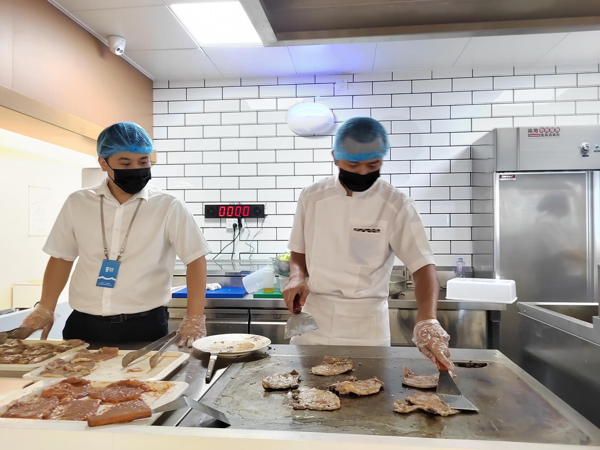 在講座交流活動(dòng)中,由廚師現(xiàn)場烹飪了嫩滑豬肉片、香菇馬蹄肉餅、牛扒、黑椒脆皮雞扒等產(chǎn)品,菜品口感得到大家現(xiàn)場試吃后的一致好評??头呒壗?jīng)理陳蔚彰說,通過今天的活動(dòng),對預(yù)制菜的了解有了更直觀的認(rèn)識,預(yù)制菜不僅能夠解決學(xué)校食堂對于操作便捷高效、出品質(zhì)量穩(wěn)定的需求,而且口感嫩滑,符合學(xué)生普遍的口味。