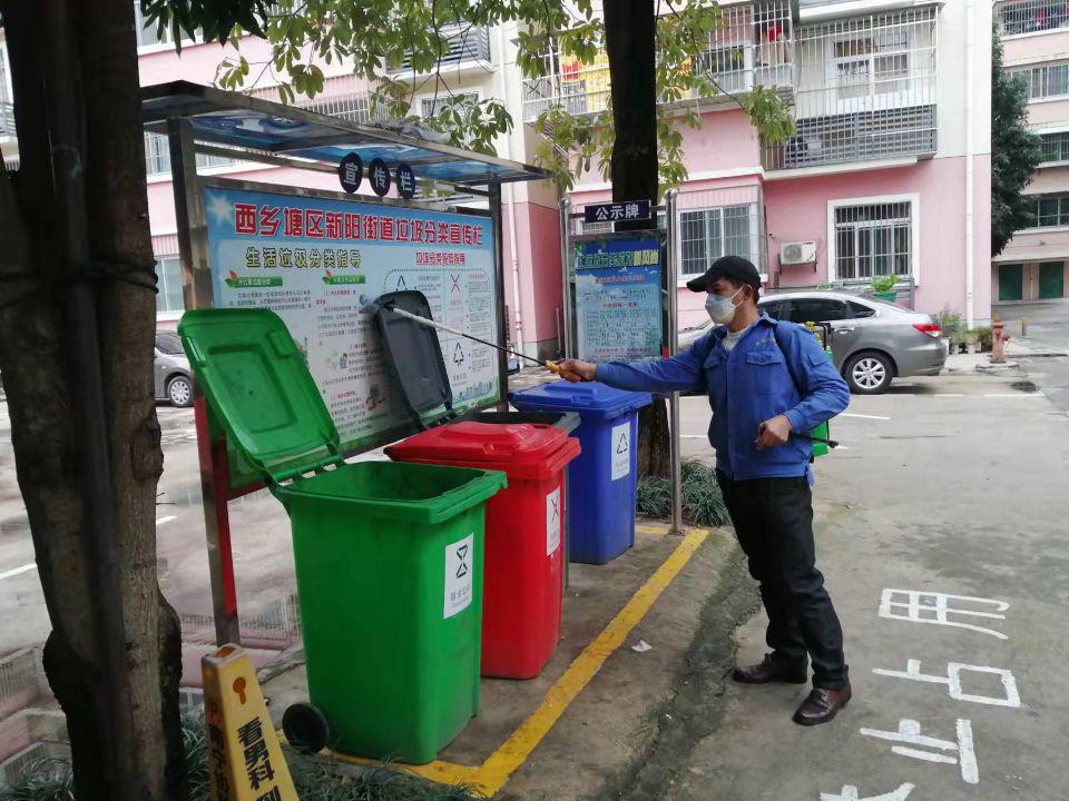 保潔人員對新陽造紙廠生活區(qū)分類垃圾桶進行消殺