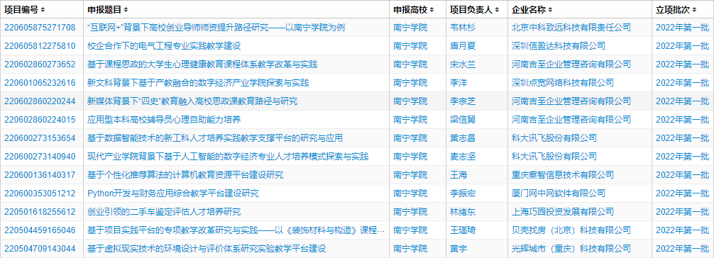 2023年2月6日,教育部高等教育司公布2022年第二批產(chǎn)學(xué)合作協(xié)同育人項目立項名單,南寧學(xué)院14個項目獲得立項,加上2022年第一批獲批項目,南寧學(xué)院2022年共有28個項目獲得教育部產(chǎn)學(xué)合作協(xié)同育人項目立項,總獲得資金支持68.5萬元,獲得總價值約340萬元的云平臺、軟硬件等支持。