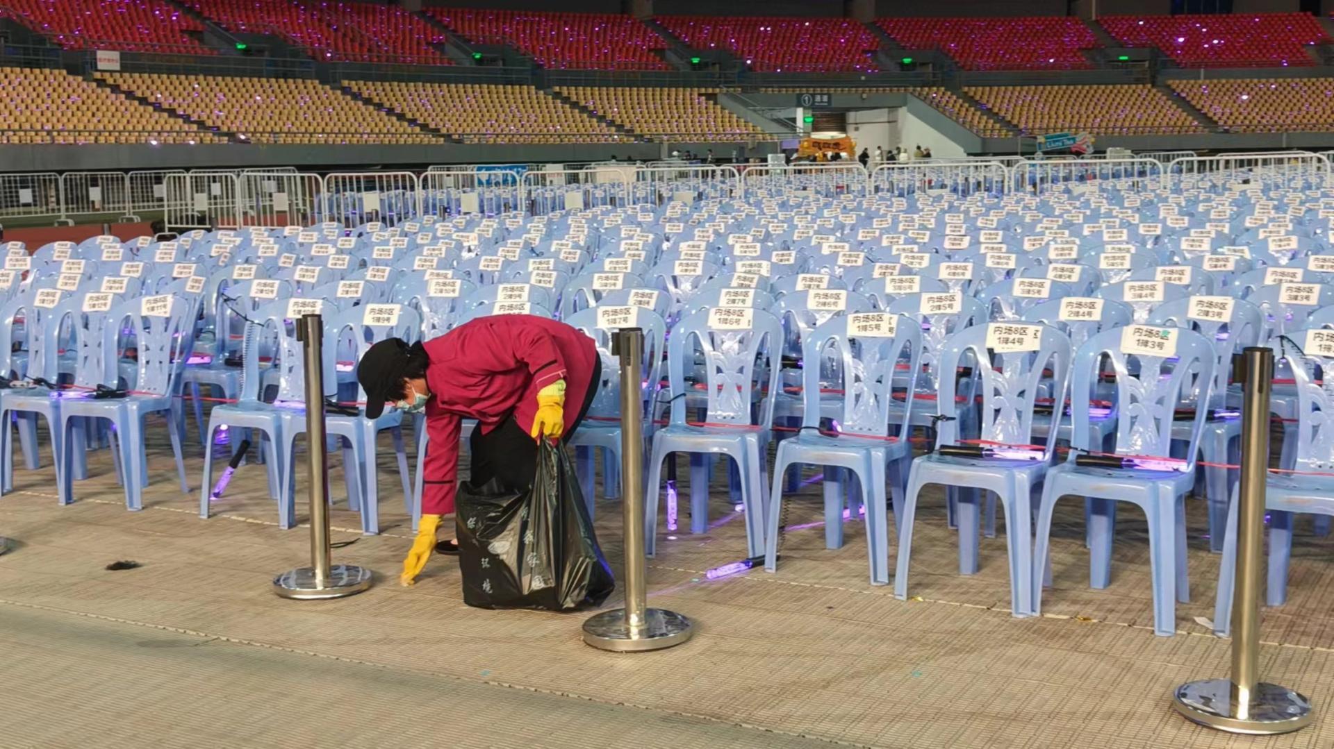 在演出籌備前夕,威凱智慧物業(yè)服務團隊累計出動120名保障人員對VIP區(qū)上萬張坐席搬運、擺放,“拉線”式調(diào)整讓場館內(nèi)座椅排列有序。