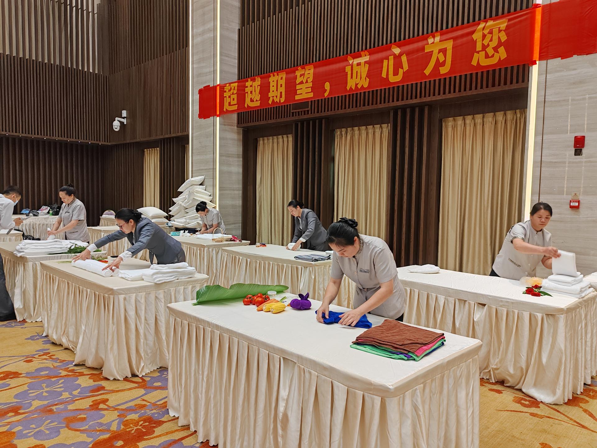 ?疊、折、卷、穿、拉、掰……選手們動作敏捷、快速利落。2023年5月6日下午,在五象山莊11號樓大宴會廳,來自安保部“車輛指揮手勢”才藝匯演,房務部“我型我秀——吉他彈唱”火熱拉開了五象山莊2023年員工趣味技能競賽活動帷幕,來自各部門11位員工進行才藝展示,90位選手參加技能競賽,將酒店服務的“工匠精神”,展現(xiàn)得淋漓盡致,營造出“比、學、趕...