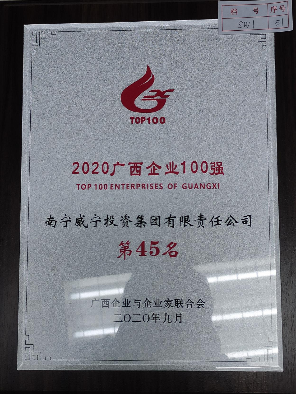 2020年9月,南寧威寧集團(tuán)榮獲南寧市南寧市企業(yè)和企業(yè)家聯(lián)合會(huì)授予的2020年度廣西企業(yè)100強(qiáng)第45名