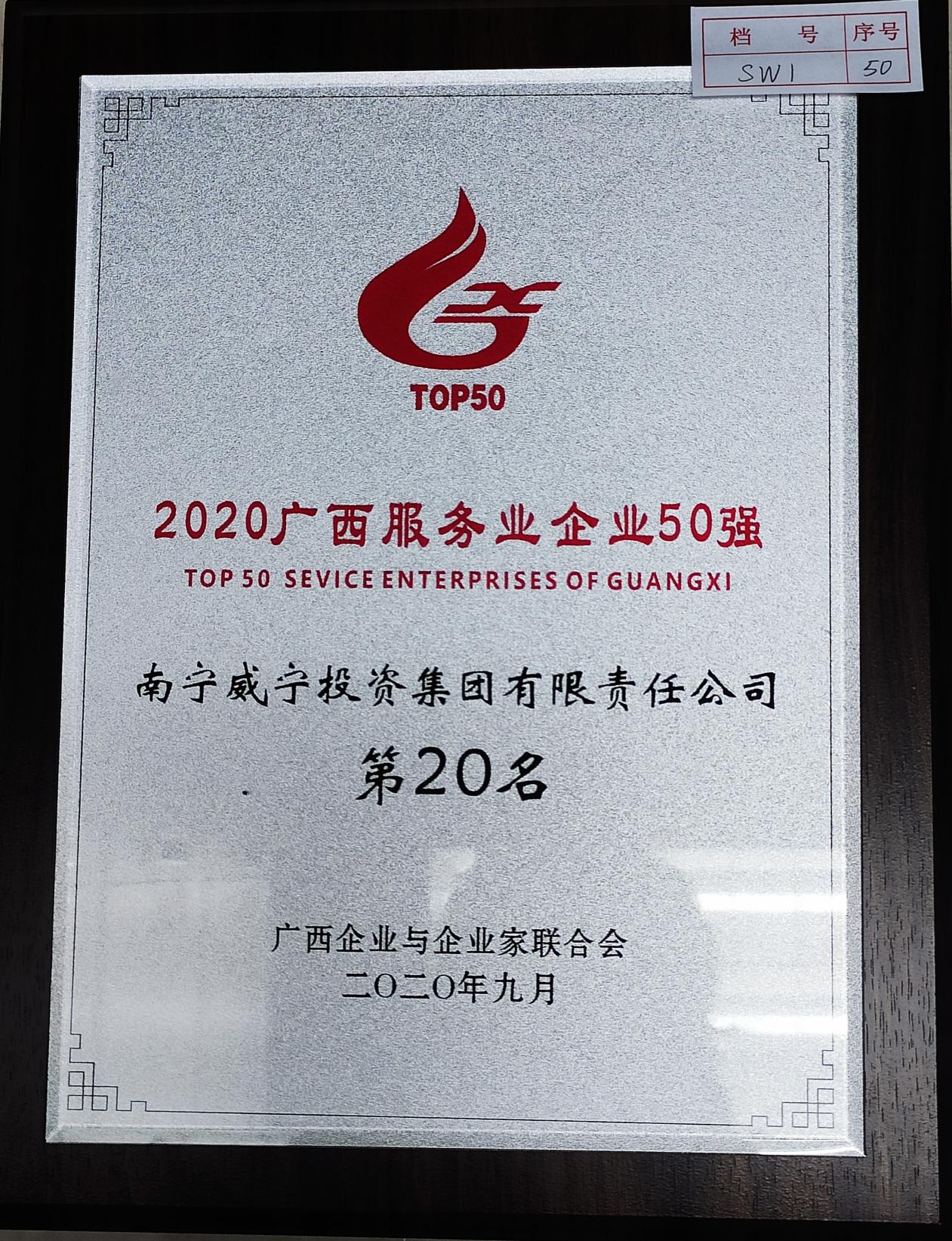 2020年9月,南寧威寧集團(tuán)榮獲南寧市南寧市企業(yè)和企業(yè)家聯(lián)合會(huì)授予的2020年度廣西服務(wù)業(yè)企業(yè)50強(qiáng)第20名