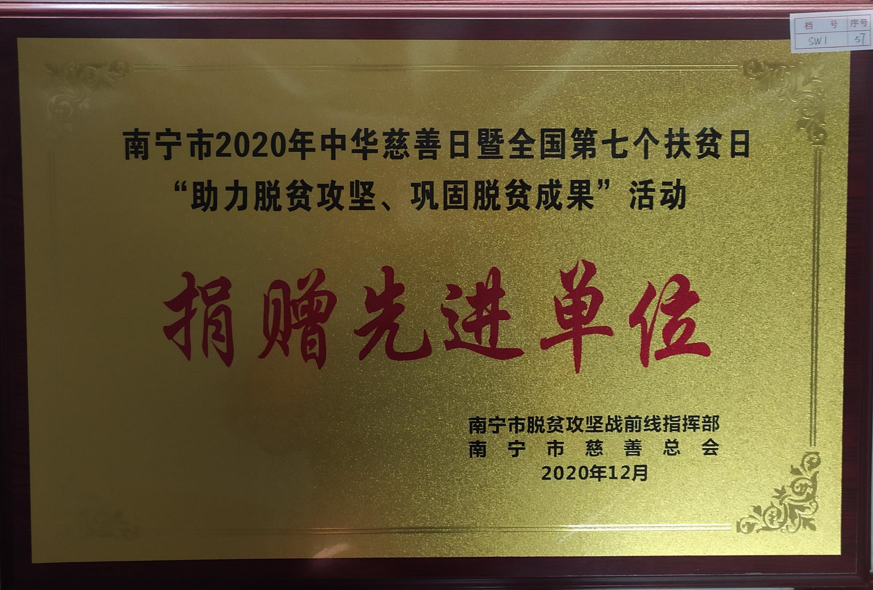 2020年12月,南寧威寧集團(tuán)榮獲南寧市脫貧攻堅(jiān)戰(zhàn)前線指揮部、南寧市慈善總會(huì)授予的南寧市2020年中華慈善日暨全國(guó)第七個(gè)扶貧日“助力脫貧攻堅(jiān)、鞏固脫貧成果”活動(dòng)