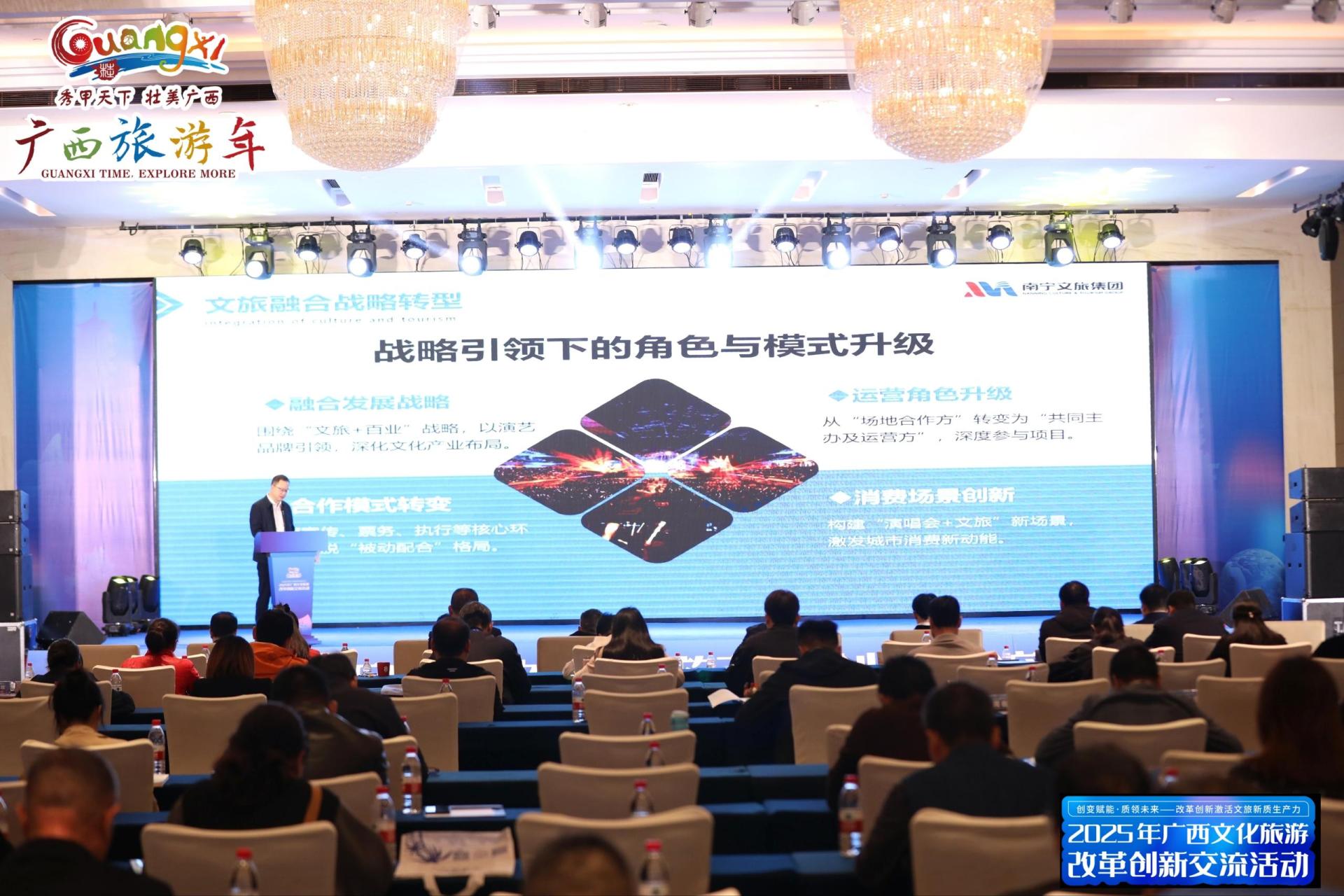 11月4日,在2025年廣西文化旅游改革創(chuàng)新交流活動現(xiàn)場,南寧威寧集團(tuán)副總經(jīng)理馮剛系統(tǒng)分享了“文旅+演藝”融合創(chuàng)新模式的實踐經(jīng)驗與探索心得,引發(fā)廣泛關(guān)注與熱烈反響。作為南寧建設(shè)區(qū)域性國際文化旅游中心城市的核心引擎,在南寧威寧集團(tuán)的指導(dǎo)下,南寧文旅集團(tuán)以“跟著演出游廣西”為核心引領(lǐng),突破傳統(tǒng)文旅服務(wù)的邊界局限,完成了文旅產(chǎn)業(yè)的深度升級。集團(tuán)將專業(yè)化服務(wù)貫穿演藝項目宣傳推廣、票務(wù)運營、落地執(zhí)行全周期,徹底扭轉(zhuǎn)以往“被動配合”的合作格局,通過系統(tǒng)性創(chuàng)新構(gòu)建起“演唱會+文旅”消費新生態(tài)。