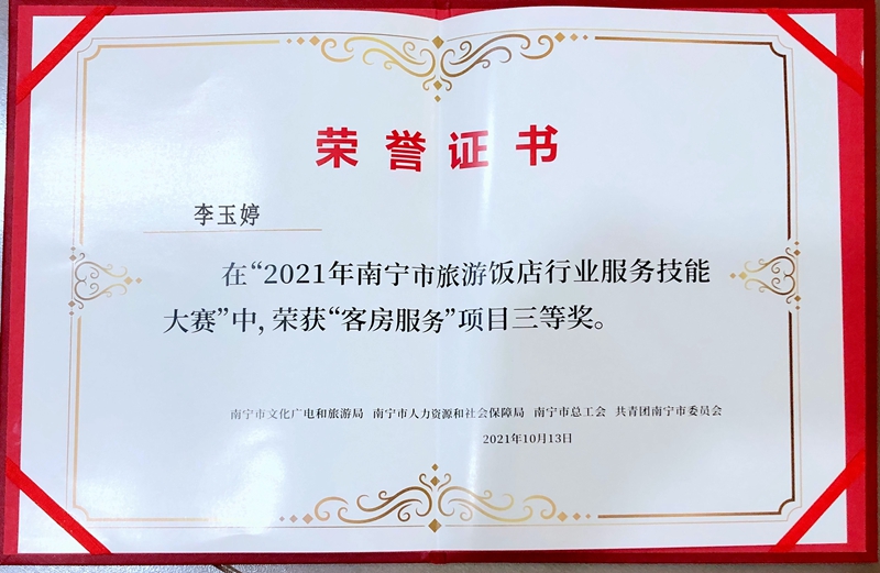 近日,銀河大酒店在由南寧市文化廣電和旅游局、人力資源和社會保障局、市總工會、共青團南寧市委員會共同主辦的2021年南寧市旅游飯店行業(yè)服務技能大賽中榮獲最佳組織獎,客房部員工李玉婷獲客房服務項目三等獎。