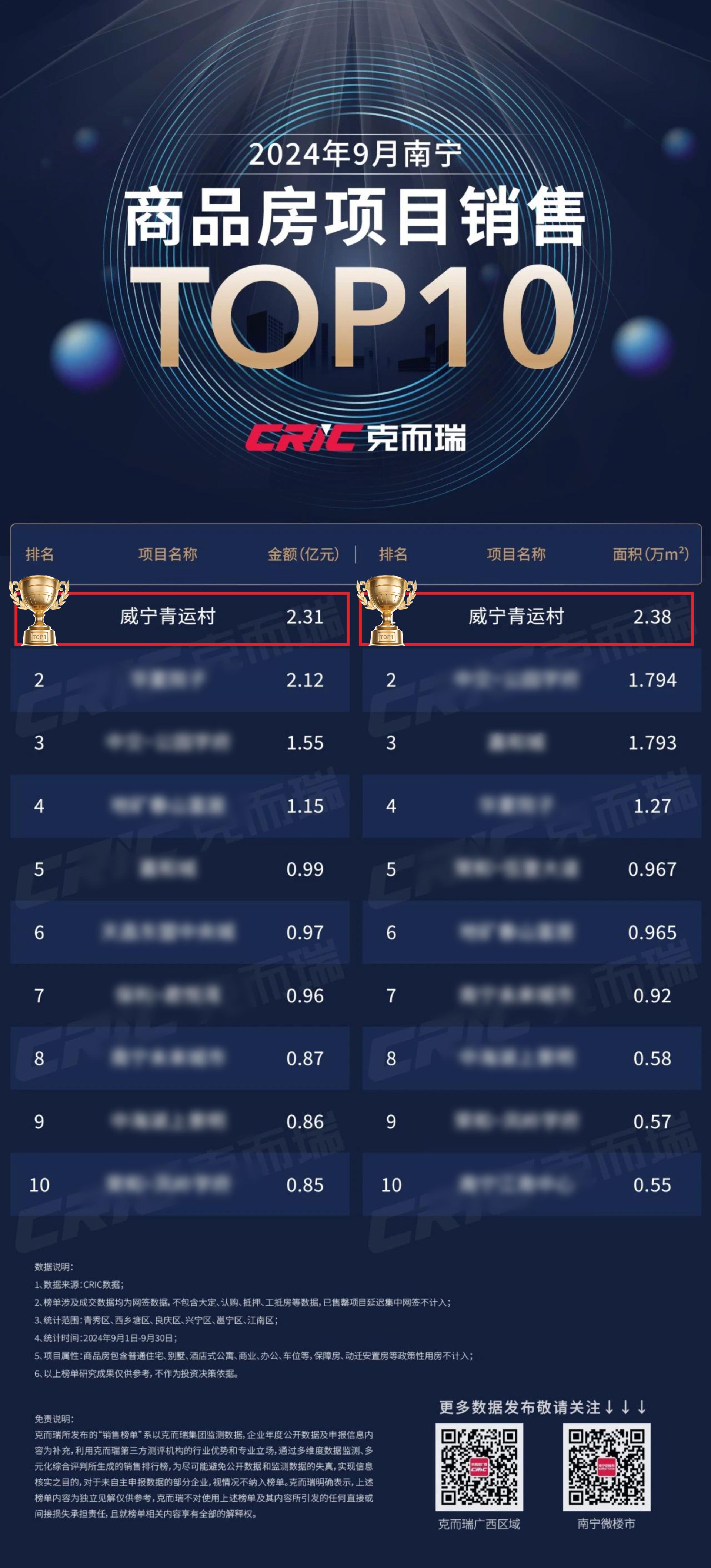 9月,威寧青運村成交熱潮此起彼伏,再現(xiàn)“現(xiàn)象級”勁銷盛況,以銷售金額2.31億元,銷售面積2.38萬㎡登頂“2024年9月南寧商品房項目銷售”雙TOP1,持續(xù)領(lǐng)跑南寧樓市。