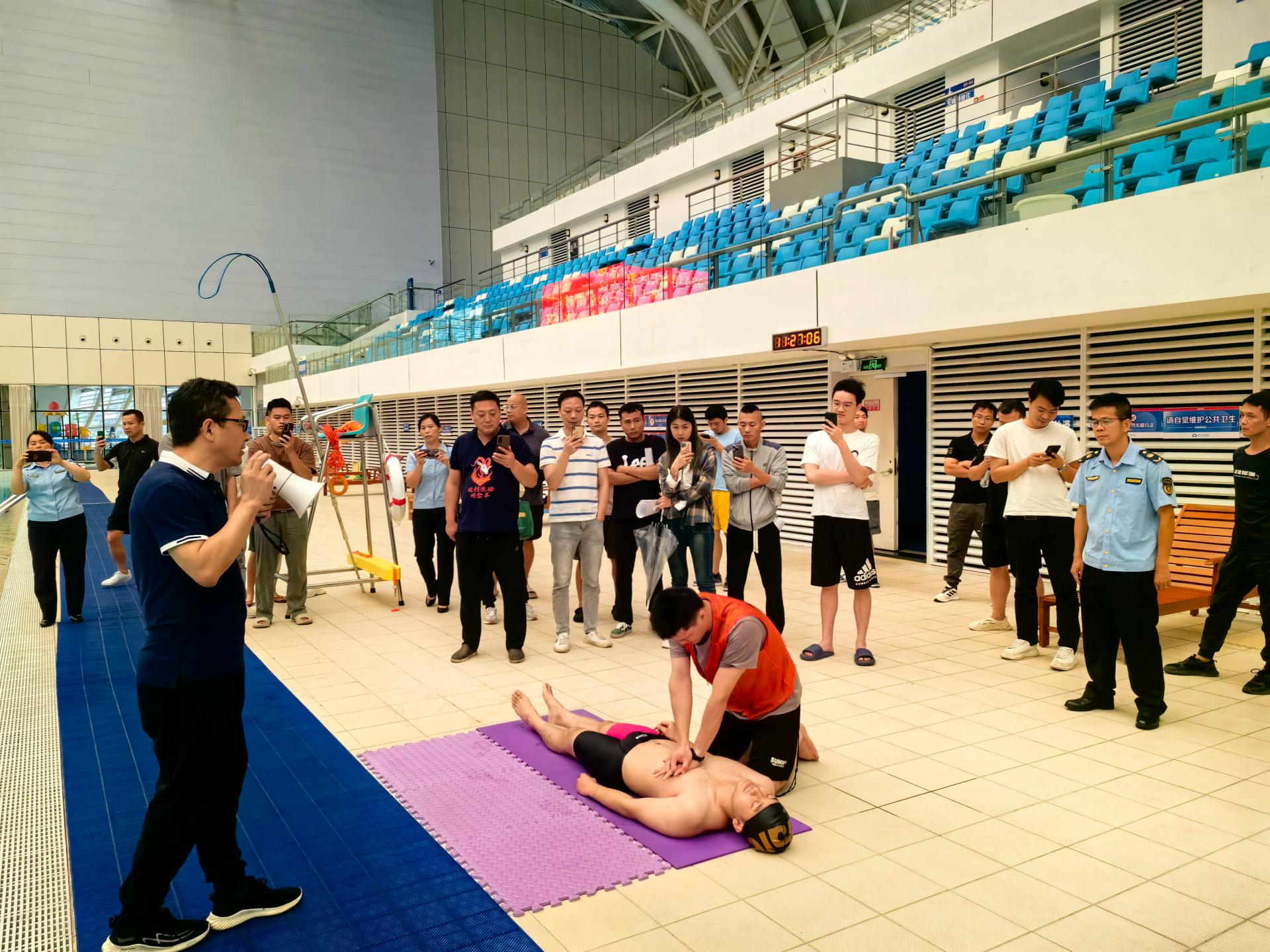 會后,廣西體育中心游泳館救生員進行防溺水應(yīng)急救援演練,模擬救生員對不慎落水的“游客”進行施救的情景。同時,還現(xiàn)場演示了如何進行心肺復(fù)蘇、協(xié)同救援等工作流程,切實提高游泳救生員的專業(yè)救助能力。