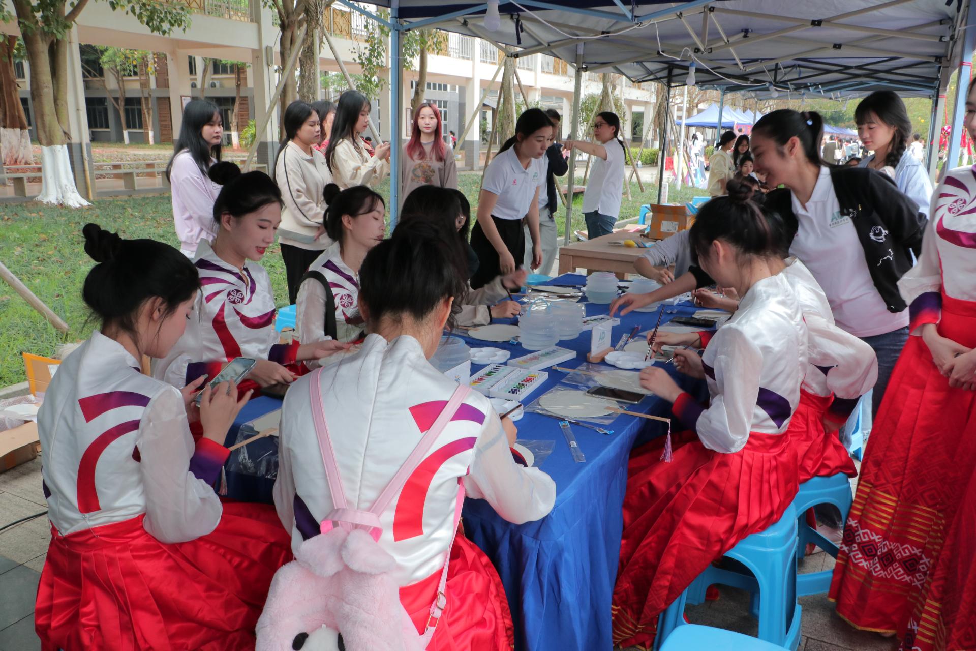 走進民俗文化街區(qū),學(xué)校師生身著廣西少數(shù)民族盛裝迎面而來。民俗文化街區(qū)設(shè)置了傳統(tǒng)民俗藝術(shù)體驗以及傳統(tǒng)美食品嘗攤位以推介風(fēng)土人情,讓師生們一站式打卡廣西的特產(chǎn)風(fēng)物。現(xiàn)場活動包括民族服裝試穿、陶藝、繡球、香囊、壯錦、剪紙等手工藝品制作體驗及展示。在此,老師同學(xué)們不僅可以品味艾葉粑粑、青團、彩蛋等壯族特色美食,還可以過一把唱山歌的癮。民族趣味游園區(qū),廣西少數(shù)民族傳統(tǒng)體育活動在此開展得如火如荼,竹竿舞榔聲朗朗,節(jié)奏鏗鏘,表達著對五谷豐登、幸福吉祥的祈求和渴望;旁邊的五彩繡球在揮拋中展現(xiàn)壯鄉(xiāng)風(fēng)情;投壺和三人板鞋趣味運動等多項深受師生喜愛的活動,吸引了師生的積極參與,現(xiàn)場氣氛熱烈,歡聲笑語不斷。沉浸式體驗“廣西三月三”,共同感受節(jié)日的歡樂和溫暖。