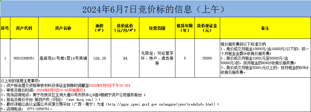 2024年6月7日競價標(biāo)的信息(線上競價)