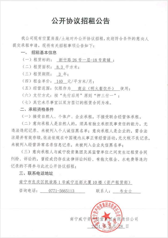 新竹路26-18號商鋪公開協(xié)議招租公告