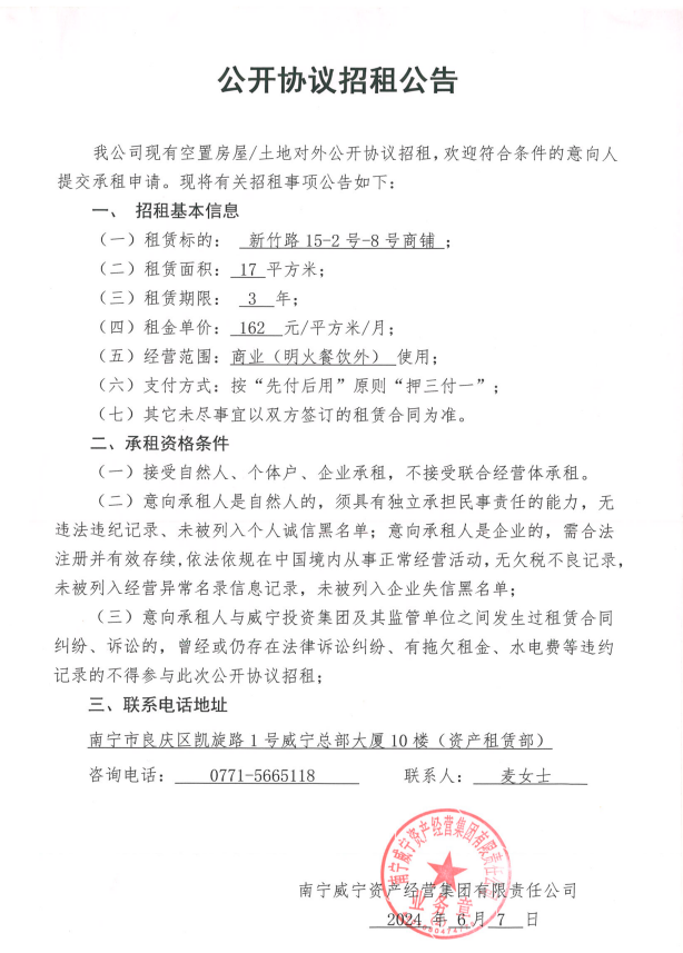新竹路15-2-8號商鋪公開協(xié)議招租公告