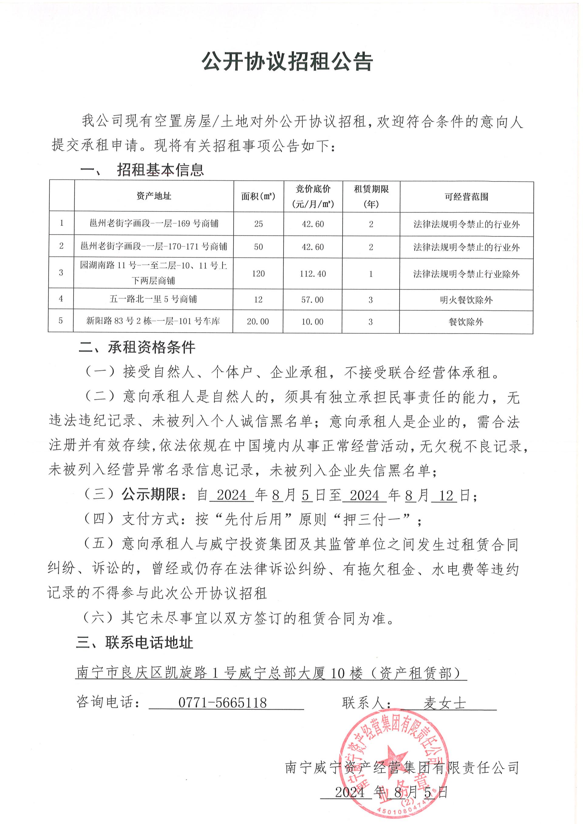 邕州老街、園湖南路、五一路、新陽(yáng)路等資產(chǎn)公開(kāi)協(xié)議招租公告