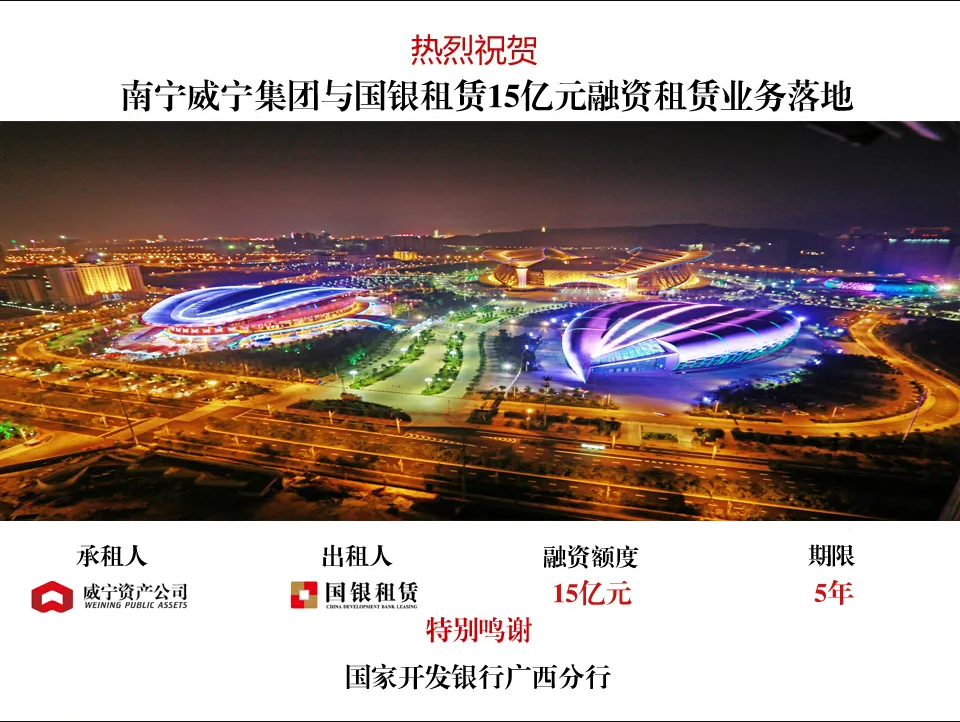 2020年4月27日,南寧威寧集團(tuán)與國銀租賃五年期、15億元融資租賃(售后回租)業(yè)務(wù)完成協(xié)議簽訂并成功首次提款3.5億元,剩余額度將根據(jù)資金需求分批次提款。這是南寧威寧集團(tuán)繼與交銀租賃、招銀租賃、浦銀租賃、外貿(mào)租賃成功合作后再次獲得國內(nèi)主流大型金融租賃機構(gòu)的大力支持,表明了金融機構(gòu)對集團(tuán)償債能力以及未來改革發(fā)展持續(xù)向好的充足信心。