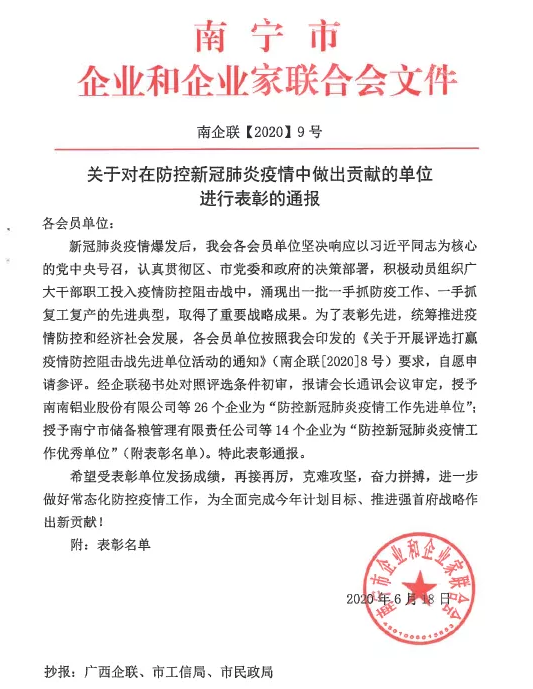 近日,從南寧市企業(yè)和企業(yè)家聯(lián)合會傳來喜訊,南寧威寧集團、南寧百貨大樓公司、威寧生態(tài)園公司喜獲“防控新冠疫情工作先進單位”;儲備糧公司、天恒電影公司、威寧捷信公司、威寧酒店公司喜獲“防控新冠疫情工作優(yōu)秀單位”。