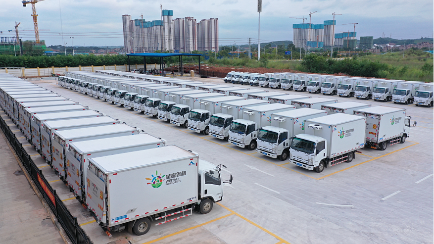 配送現(xiàn)場配送發(fā)車2020年11月2日,南寧市第一批50所公辦學(xué)校正式開始食材集中采購集中配送服務(wù)。首日配送食材數(shù)量達(dá)20噸左右,最長配送線路往返達(dá)136公里。配送前檢測出兩批次食材農(nóng)殘超標(biāo),涉及200千克左右蓮藕以及少量韭菜,配送前農(nóng)殘超標(biāo)食材已全部進(jìn)行處理,保障了學(xué)校的食材安全。11月2日凌晨2時,位于五象新區(qū)的威耀供應(yīng)鏈公司五象配送基地現(xiàn)場燈火通明、熱火朝天,進(jìn)入正式配送前的臨戰(zhàn)狀態(tài):各學(xué)校食
