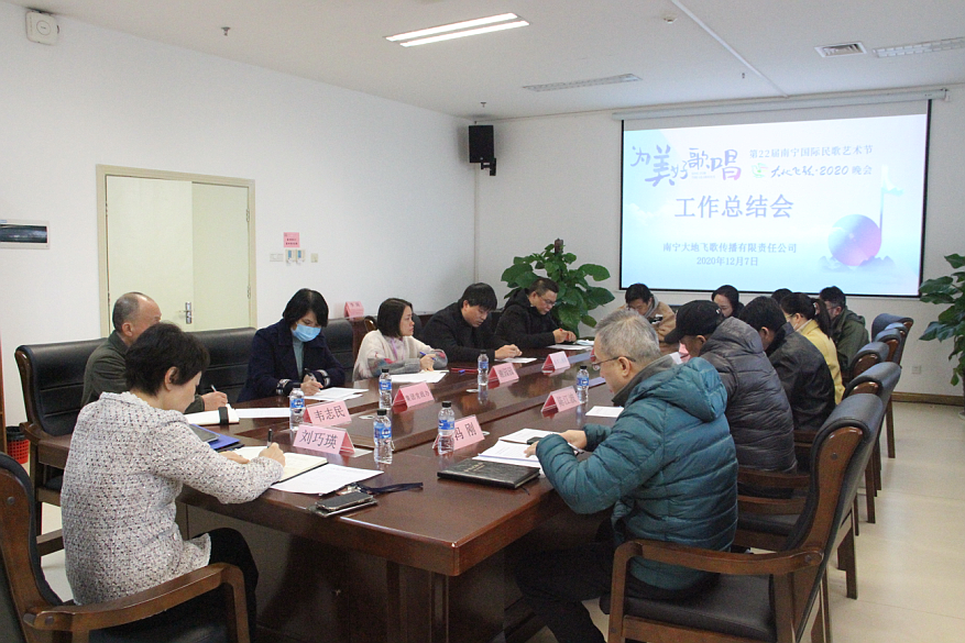 晚會(huì)工作總結(jié)會(huì)現(xiàn)場(chǎng)近日,南寧大地飛歌文化傳播有限責(zé)任公司召開(kāi)第22屆南寧國(guó)際民歌藝術(shù)節(jié)“大地飛歌·2020”晚會(huì)(以下簡(jiǎn)稱“晚會(huì)”)工作總結(jié)會(huì),對(duì)晚會(huì)各項(xiàng)工作進(jìn)行全面梳理總結(jié),并結(jié)合當(dāng)前市場(chǎng)趨勢(shì)討論下一年度工作發(fā)展計(jì)劃。集團(tuán)黨委副書(shū)記書(shū)記、總經(jīng)理劉巧瑛出席會(huì)議。會(huì)上,大地飛歌集團(tuán)公司各部門(mén)負(fù)責(zé)人就晚會(huì)各項(xiàng)工作進(jìn)行了總結(jié),詳細(xì)分析晚會(huì)工作中存在的問(wèn)題和不足,提出了意見(jiàn)建議。同時(shí)結(jié)合當(dāng)前市場(chǎng)融合線上線