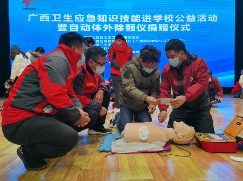 2020年12月16日,自治區(qū)衛(wèi)生健康委聯(lián)合南寧急救醫(yī)療中心舉辦衛(wèi)生應(yīng)急知識技能進(jìn)學(xué)校公益活動暨自動體外除顫儀捐贈儀式,威寧文體公司副總經(jīng)理黃慶全帶隊參加活動,并代表公司受贈自動體外除顫儀(AED)。