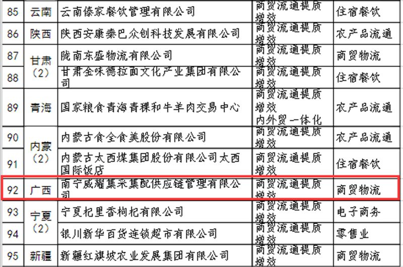 8月5日,國(guó)家商務(wù)部和市場(chǎng)監(jiān)督管理總局公示“國(guó)家級(jí)服務(wù)業(yè)標(biāo)準(zhǔn)化試點(diǎn)(商貿(mào)流通專(zhuān)項(xiàng))”評(píng)審結(jié)果,威耀供應(yīng)鏈公司是廣西唯一一家入選企業(yè)。
