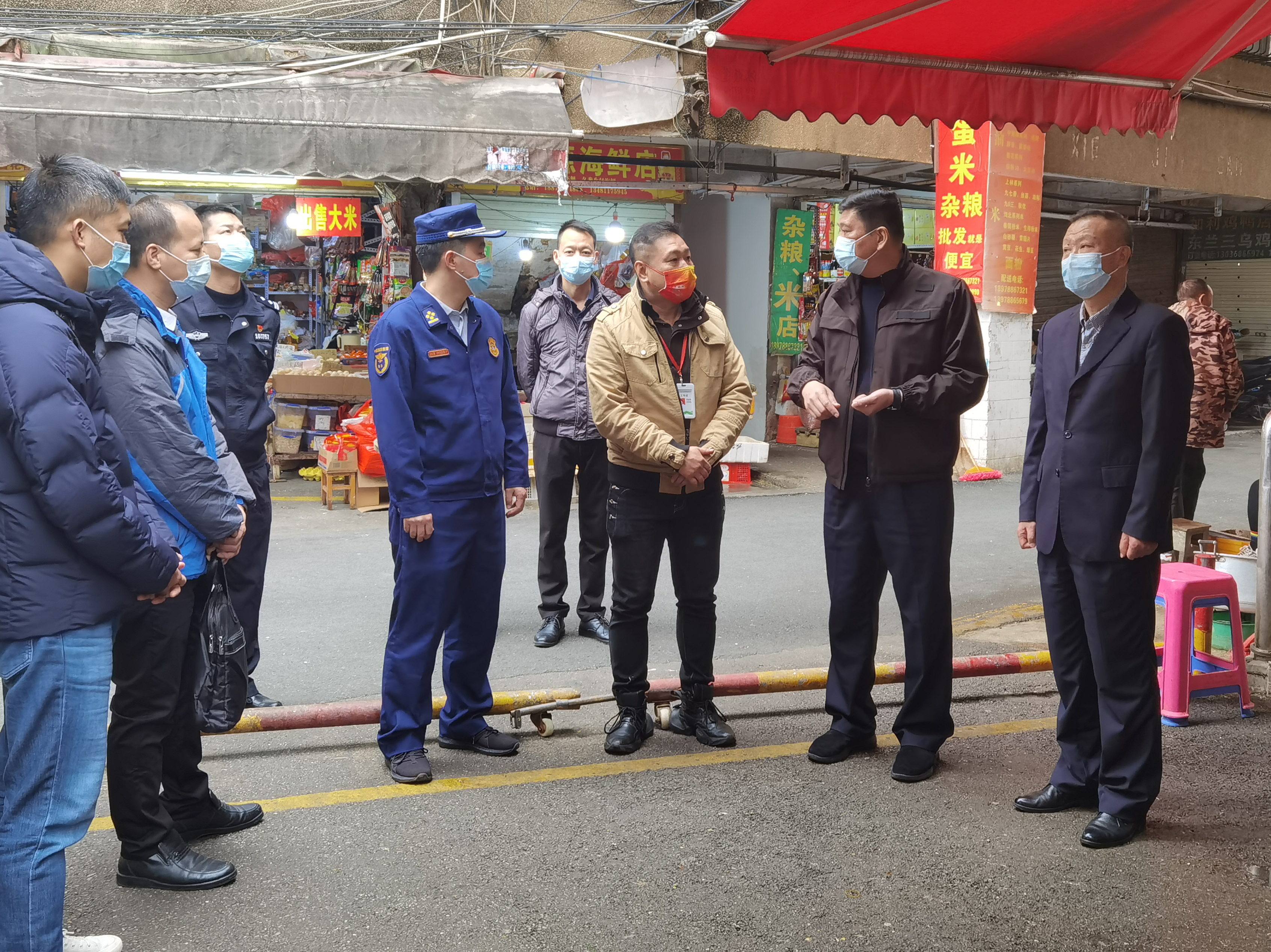 檢查現(xiàn)場(chǎng)近日,南寧市青秀區(qū)副區(qū)長(zhǎng)、青秀公安分局局長(zhǎng)傅來(lái)大帶隊(duì)檢查威寧市場(chǎng)公司所屬津頭市場(chǎng)節(jié)前疫情防控及消防安全工作。檢查中,傅來(lái)大重點(diǎn)查看了市場(chǎng)各出入口進(jìn)出人員落實(shí)“二碼聯(lián)查”、測(cè)溫登記工作情況,聽取津頭市場(chǎng)區(qū)域運(yùn)營(yíng)經(jīng)理李鈺明關(guān)于春節(jié)期間市場(chǎng)疫情防控及安全生產(chǎn)工作的措施介紹,并深入各行業(yè)查看市場(chǎng)內(nèi)人員規(guī)范佩戴口罩及市場(chǎng)環(huán)境衛(wèi)生狀況,仔細(xì)查閱市場(chǎng)“每日消殺”和滅四害工作臺(tái)賬。傅來(lái)大對(duì)津頭市場(chǎng)嚴(yán)格落實(shí)