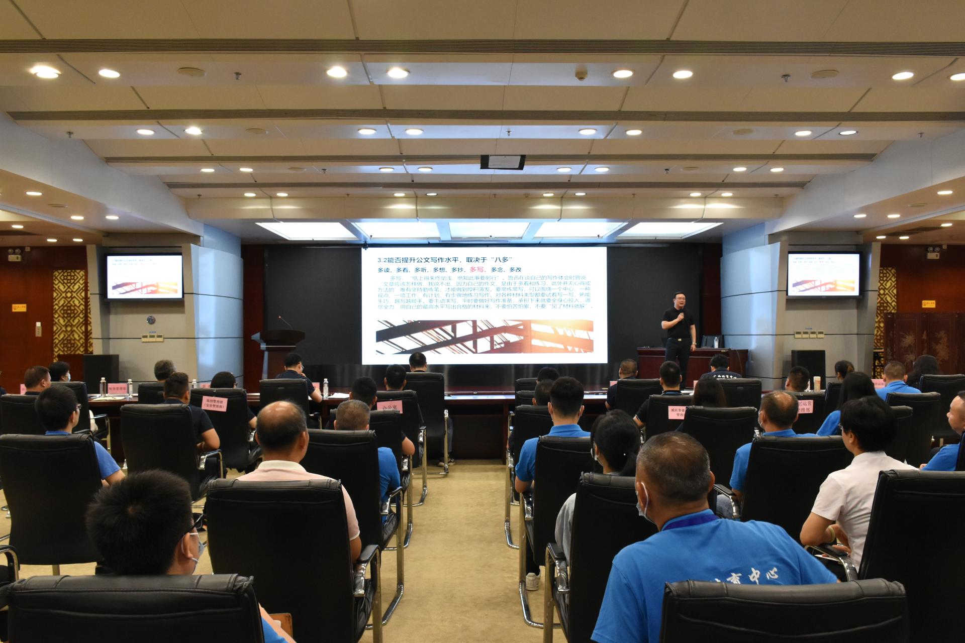 2022年7月11日上午,威寧文體公司舉行公文寫作和辦理培訓會。此次培訓由黨支部書記、董事長黃志煒主講。黃志煒同志從“公文是什么、寫好公文對提升工作對個人事業(yè)的特殊作用、如何速成公文、常見錯誤及其對策、各層級人員公文工作責任要求”等11個方面著手,既有詳盡規(guī)范的基礎概念、也有大家關心的實用性“技巧、攻略”,還有“八心(決心、信心、誠心、用心、良心、細心、專心、恒心)”“八多(多讀、多看、多聽、多...