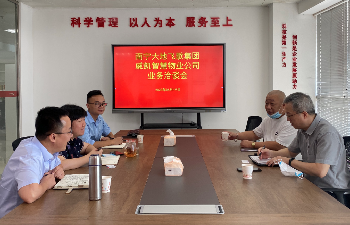 南寧大地飛歌集團與威凱智慧物業(yè)公司就“云歌會”等工作開展業(yè)務洽談