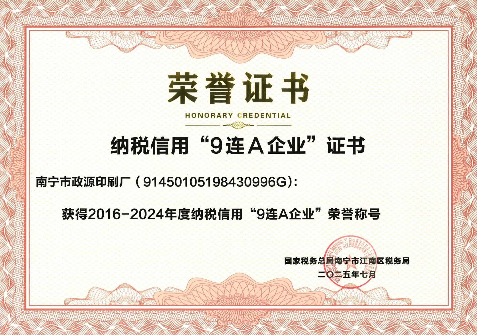 連續(xù)9年!南寧市政源印刷廠喜獲2016-2024年度納稅信用“9連A企業(yè)”榮譽(yù)稱號