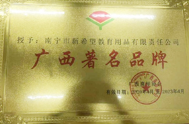 2020年4月,廣西商標(biāo)協(xié)會(huì)正式授予南寧市新希望教育用品有限責(zé)任公司及其持有的商標(biāo)為“廣西著名品牌”,這是對(duì)新希望公司二十余年發(fā)展和工作充分的肯定。